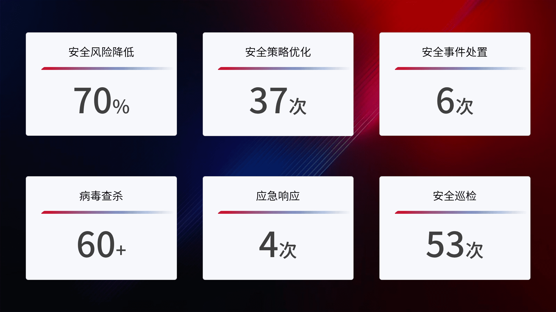 提供全面的安全事件报告体系,,,包括处置报告、、周报、、季度和年度总结,,结合持续监控,,,帮助客户深入了解网络安全状况。。